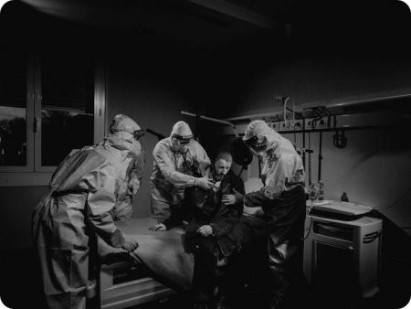 Alors qu’il cherchait de nouveaux moyens d’approche , la pandémie a commencé à entrer dans ses photos. Ses sujets se se sont transformés progressivement en personnages masqués au moment où le nombre de morts croissait et qu’une menace lointaine au début s’approchait maintenant de Reggio Emilia.