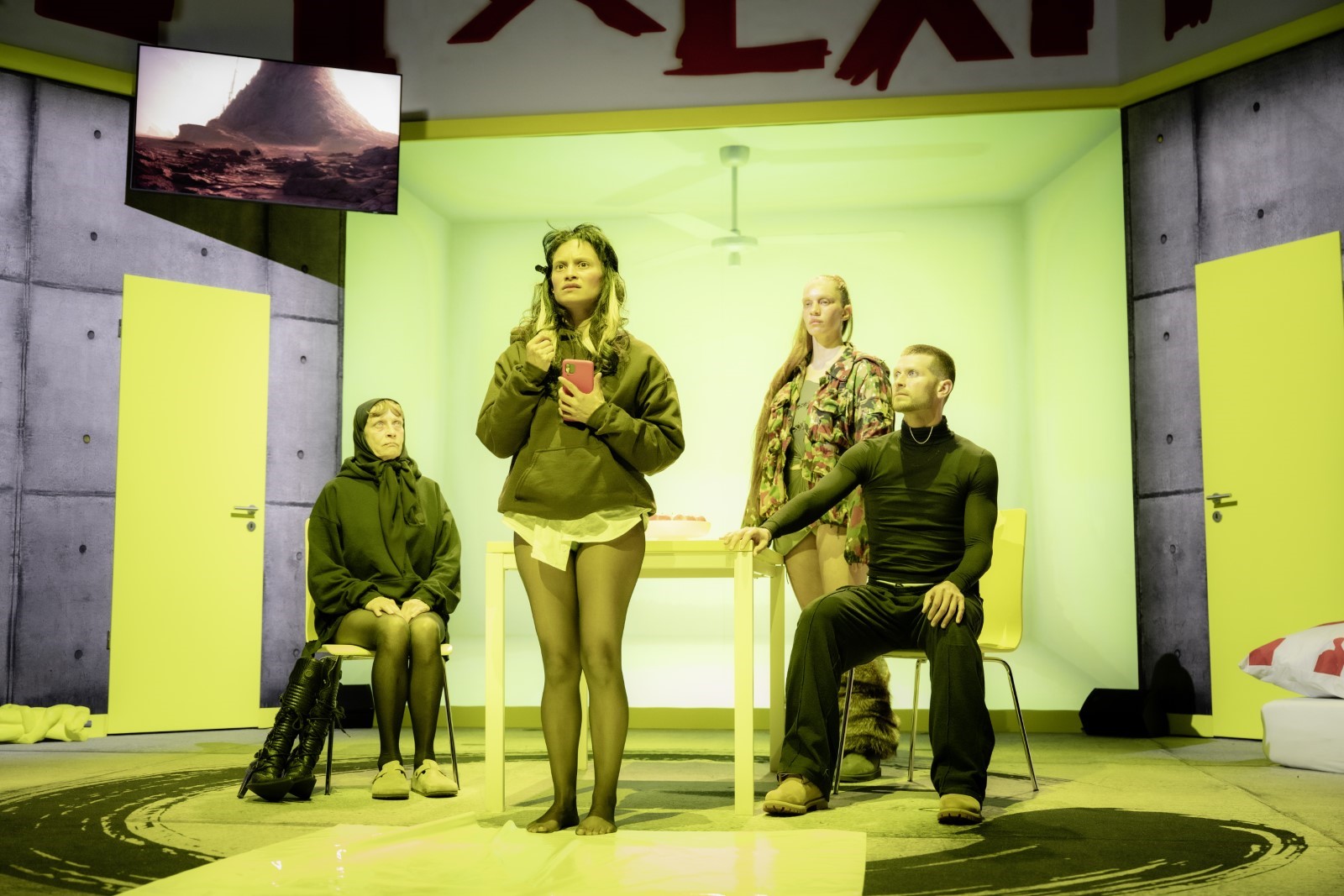 Dans un décor flashy, constitué de simulacres montrés comme tels, une jeune femme siège sur son lit, les yeux se fixant alternativement sur son Smartphone et dans le vide, à moins que ce ne soit sur le public. Des sons sourds accompagnent l’ouverture des portes qui précède chacune des visites qu’elle reçoit.