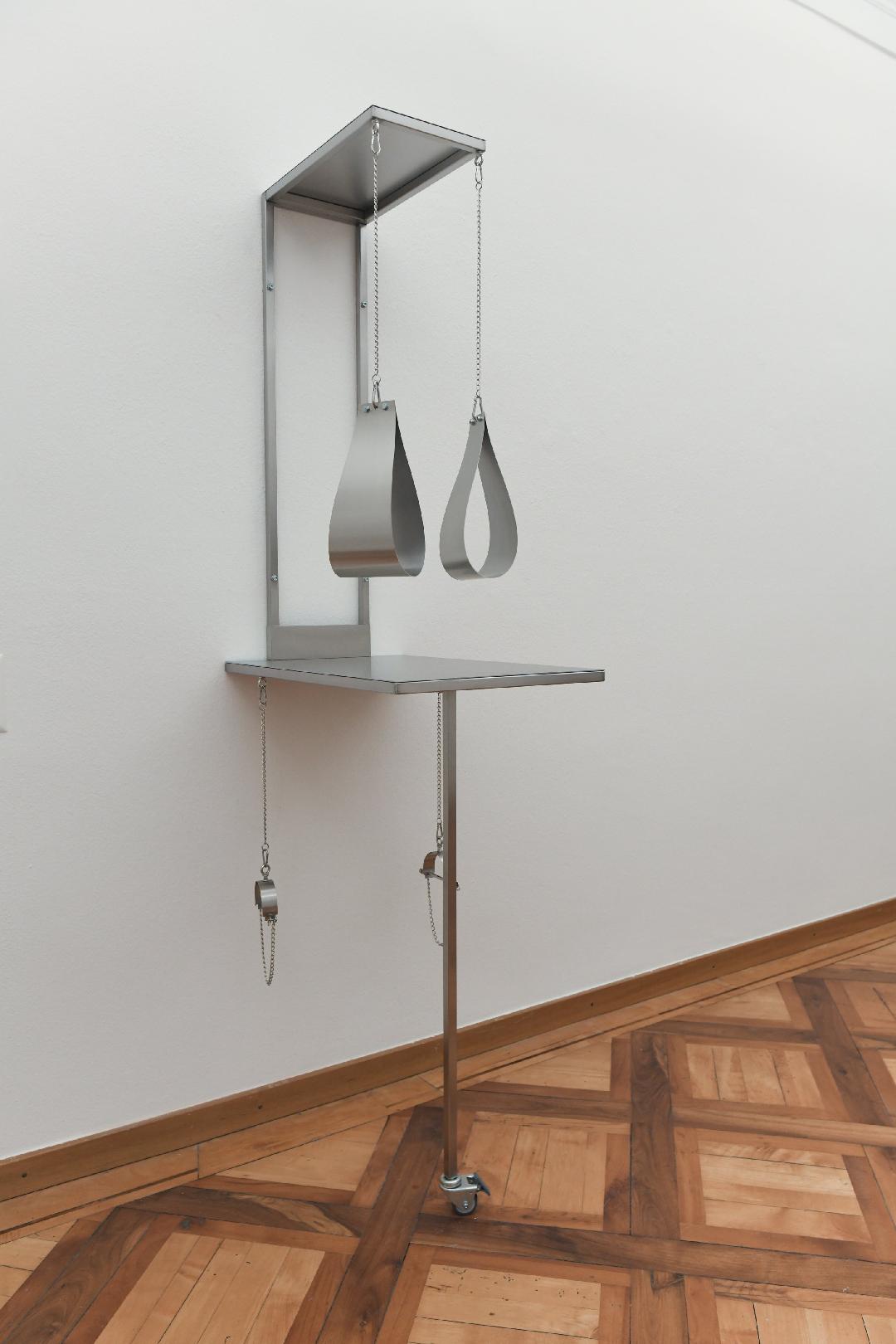 Inspirées des tables utilisées dans les salons de toilettage canin, ces œuvres regorgent de références à différentes pratiques d’entraînement : accessoires à mi-chemin entre laisses et fils, flacons en verre contenant un liquide à base de phéromones.