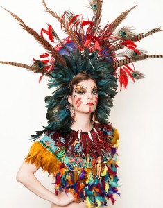 Partie vivre à Londres, Anne Sophie Cochevelou crée une œuvre où l’aspect performatif est toujours ludique, excentrique, angoissant et impertinent. La créatrice recueille pour les assembler des objets de la culture consumériste de masse et elle les chorégraphie au sein de cultures plus ou moins exogènes. La propension accumulatrice et récupératrice permet à l’œuvre de se poursuivre (cf. ci-contre Indiens vs Cowboys, 2016. Plastron et coiffe © Anthony Lycett ).