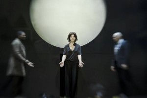 Le vent souffle sur un paysage non identifiable, laissant défiler des nuages des ombres des nuées, comme au ralenti. L’écran en fond de scène est occupé en son centre par un cercle dont la lumière pleine ou voilée est mobilisée sous différents aspects au cours de la représentation. Sous le cercle, une porte, autour, des paysages défilent, créant une atmosphère sombre et radieuse. Sur le devant de la scène, encastrés dans le plateau, des éléments de mobilier. Les costumes, contemporains, sont assez neutres. La pièce est traitée globalement, dans l’ambivalence de son sens, qui semble réinvesti à chaque instant par les personnages. Un grand texte, qui dit toute la fragilité de la condition humaine.