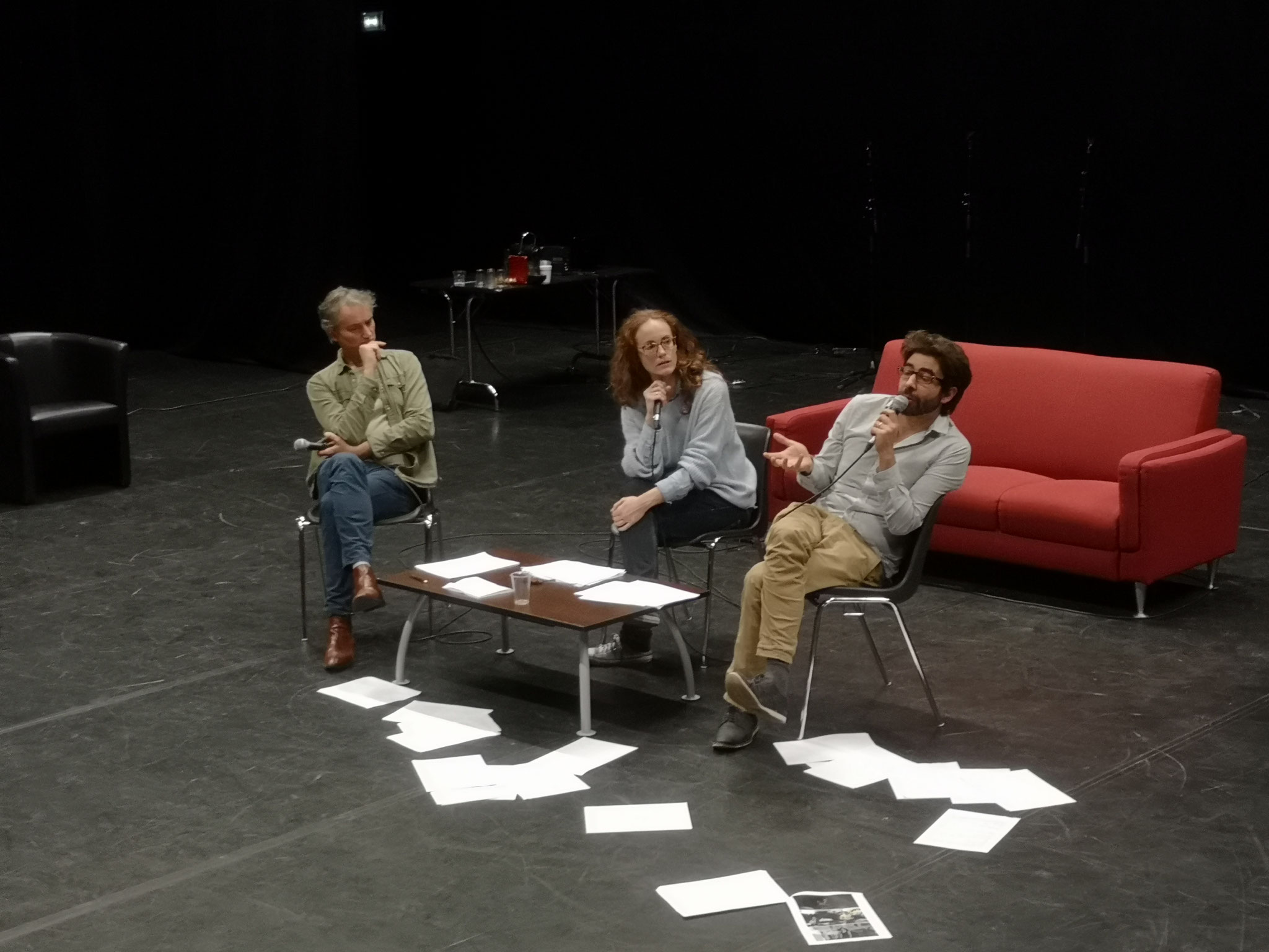 Comme dans un certain nombre de réalisations scéniques, le public essentiellement estudiantin sur le plateau, comme celui de la salle, en position frontale, est pris à témoin. A son tour, celui-ci pose des questions mi jargonneuses, mi satiriques aux trois présences, se prêtant ainsi au jeu initié par le vrai faux metteur en scène.