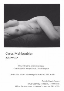 Cyrus Mahboubian, Murmur, commissaire de l’exposition : Alison Bignon, Galerie Nivet Carzon, Paris, 13 – 17 avril 2016.