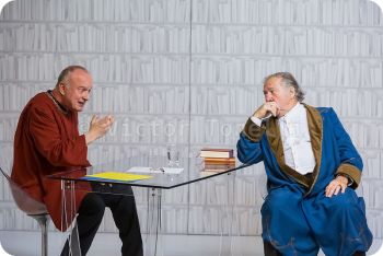 Dans une mise en scène sobre et frileuse, qui l’assigne d’une certaine manière au rang de monstre sacré, Pierre Santini semble gêné aux entournures et demeure peu enjoué. Hervé Briaux se révèle quant à lui captivant, inspiré. Les costumes d’époque figent le dialogue. Le décor, dépouillé, figurant des tranches de livres dessinées en fond de scène, n’évoque en rien les enfers et reste sans âme, un paradoxe pour un lieu accueillant des êtres privés de vie. On a le sentiment d’assister à une interview de Machiavel par Montesquieu.