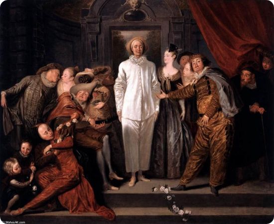 image ci-desssus : Jean Antoine Watteau, Comédiens italiens (1720)