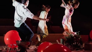 Les dialogues sont entrecoupés de chorégraphies alternant mouvements précipités et gestes pondérés. De gros ballons rouges pointillent le sol, puis l’espace. Jacob est un soldat censé revenir du front. Les amis s’invectivent, mais ne paraissent jamais dialoguer, comme si chacun déployait son propre discours, fait d’invocations indépendantes. Des confessions incomprises expriment la difficulté du dire, la trahison du monde, l’insaisissabilité du réel.