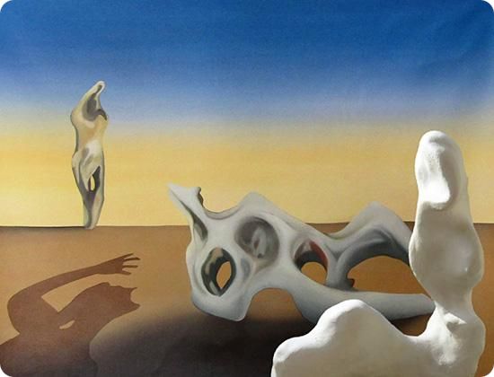 Ses paysages sont des architectures qui appartiennent à ce qu’Hundertwasser appelait les « taupes voyantes » capables de créer la traversée des apparences dans une dimension presque apocalyptique modulée selon une perfection qui va néanmoins et progressivement permettre de rapatrier l’être dans sa Demeure (ethos).