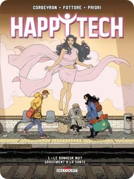 Éric Corbeyran (scénario), Alessia Fattore (dessin) & Giulia Priori (couleur), Happytech – t.01 : Le Bonheur nuit à la santé, Delcourt, coll. « Machination », mars 2022, 64 p. – 15,50 €.