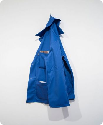 Una giacca da lavoro (appunto) fatta di un bel tessuto blu intenso e con le tasche piene di cartoline (raccolte dall’artista) e appesa accanto all’uscita dalla mostra. Come capita a tanti questo signore francese di 73 anni, non molto avvezzo alle installazioni artistiche non si fa troppi scrupoli e se la porta a casa. Si tratta pur sempre di un furto, ma certo il pensionato non avrebbe mai pensato che si era messo sulle spalle un’opera milionaria.