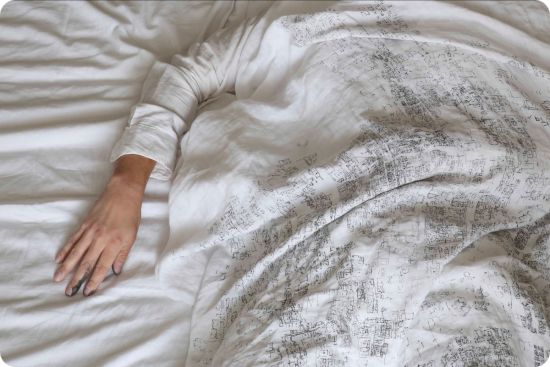Gianluigi Maria Masucci avec Cerca Dentro crée d’étranges « lux ex tenebris » où la figuration humaine émerge de manière imprévue en une enveloppe – presque linceul – au blanc sali et en des décalages où le corps se dissipe.