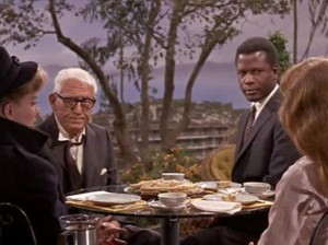 Mettre en scène un couple mixte, même s’il appartenait à la haute-moyenne bourgeoisie, devait faire date : et en effet l’histoire de la famille Drayton fit gagner au scénariste William Roses (et à la star Katharine Hepburn) l’Oscar en 1968. (ci-dessus : une scène du film).