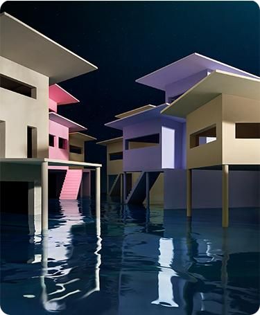 Les cités lacustres du photographe américain James Casebere sont la résultante d’étranges pavillons minimalistes, lieux vides et ambigus évoquant d’étranges « animaux » à l’affût sur les surfaces de l’eau. Existe une présence certes artificielle et comme inopinée mais qui souligne et transforme les lieux calmes par des formes rigides et cassantes.