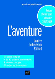 Jean-Baptiste Frossard, L’Aventure : Homère, Jankélévitch, Conrad, cours complet, 80 citations commentées, 8 résumés corrigés, 15 sujets de dissertation PUF, 2017, 312 p. – 17,90 €.