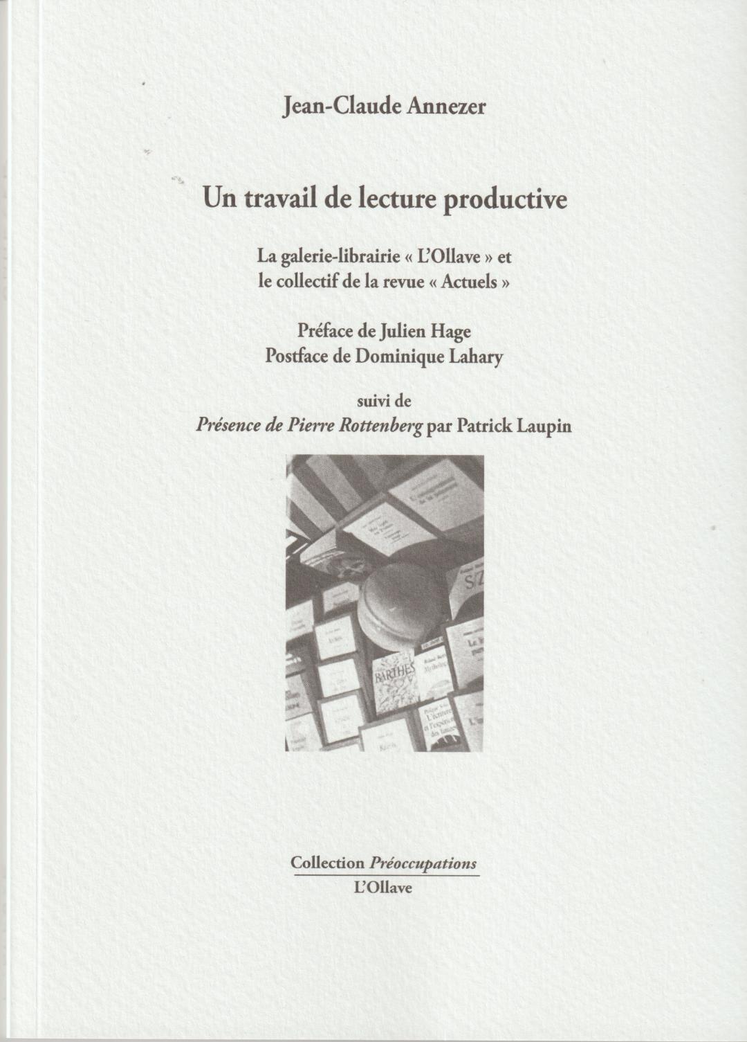 Jean-Claude Annezer,Un travail de lecture productive, L’Ollave, éditeur Collection Préoccupations, Préface de Julien Hage, Postface de Dominique Lahary, Présence de Pierre Rottenberg par Patrick Laupin , 92 p. – 15,00 €.