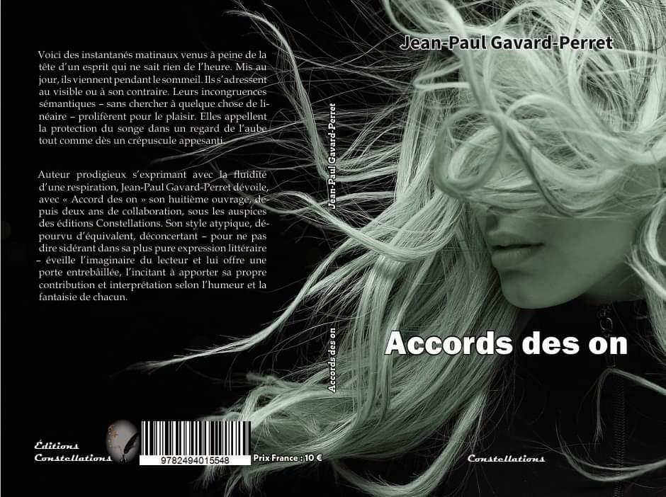Auteur prodigieux s’exprimant avec la fluidité d’une respiration, Jean-Paul Gavard-Perret dévoile, avec Accords des on son huitième ouvrage, depuis deux ans de collaboration, sous les auspices des éditions Constellations. Son style atypique, dépourvu d’équivalent, déconcertant – pour ne pas dire sidérant dans sa plus pure expression littéraire – éveille l’imaginaire du lecteur et lui offre une porte entrebâillée, l’incitant à apporter sa propre contribution et interprétation selon l’humeur et la fantaisie de chacun.