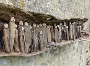 Un langage particulier, fascinant et atroce, remonte à la surface à l’image des bois-totems. Apparaissent une nécessaire rouerie et l’indispensable affront à la langue plastique qui retourne à une sauvagerie rupestre. Surgit l’histoire de l’être, histoire que le créateur ferme et laisse béante. Par une telle mise en dérive de la « crucifixion », l’artiste rend dérisoire tout grand soir, tout futur épiphanique. Les ordres des repères des corps constitués sont rompus pour nous rappeler de manière oblique (mais aussi en pleine figure) combien le corps court dans ses feintes de délivrance à sa perdition.