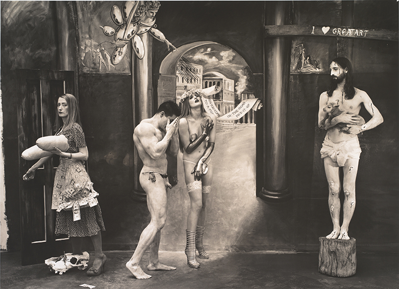 La croyance et la dévotion ne sont plus de mise ? Ou du moins elles déplacent la Passion en passion des images. Le « montrage » qui faisait du corps vénéré un organisme littéralement incroyable est déplacé, décalé à la façon d’un rébus, d’un rêve et d’une farce. Witkin s’amuse à disséminer des suites d’indices qui ne sont plus ceux des objets religieux mais de leur caricature. Le regard zigzague d’un détail à l’autre à travers clous ou couronnes, anges agressifs, croix délétères et questions de genre qui n’érigent plus la gestion des relations mystiques : elles surgissent en termes de moquerie.