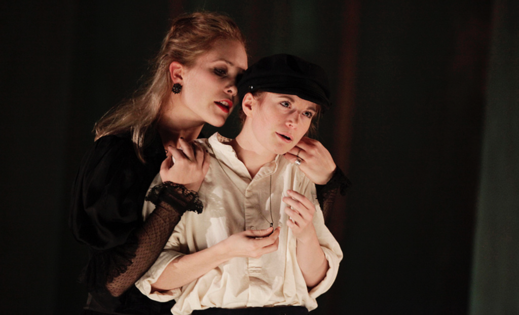 Les forces obscures et lumineuses d’un orage agitent le rideau qui s’effondre en ouvrant sur un univers apaisé, aux allures quasi monastiques. Le décor est sobre, présentant un espace modulable aux couleurs ternes mais harmonieuses, ce peut être celui d’un déambulatoire, d’un petit salon ou d’une chambre, puisque des lits viennent par moments occuper et structurer le plateau. Des imprécations nous inscrivent rapidement dans une intrigue aux allures policières, ou plutôt sentimentales. Une jeune naufragée se déguise en homme pour rechercher son frère et approcher celui qu’elle aime. Le texte, un peu décousu, peine à trouver son dynamisme. Mais l’alternance de dialogues et de pitreries, bien portée par des acteurs maîtres de leurs effets, constitue peu à peu un joli conte de tendresse, d’amour et de tristesse.