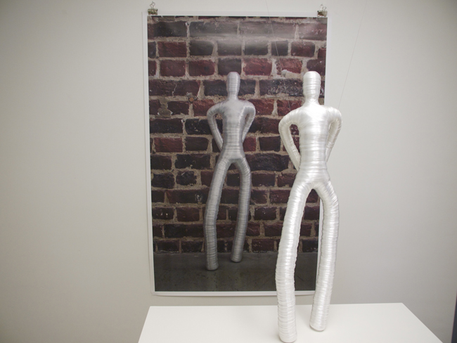 Je m’emballe  évite tout effet de précipitation mais non de recouvrement. Et de découverte tout autant. Il s’agit à la fois d’un projet esthétique particulier que ne renierait pas Christo et d’un prétexte à des rencontres choisies. L’artiste multimédia a précisé sa démarche : « Nue, munie d’un rouleau de cellophane transparent je m’emballe comme si j’enfilais une combinaison. Je la retire au bout de trois minute, j’obtiens la forme de mon corps que je retravaille suivant la pose souhaitée ».  Ensuite écrit-elle « j’ajoute des couches pour obtenir un corps dur et de petite taille ».