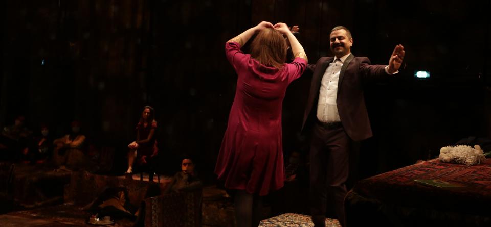 La force et la beauté du dispositif de la mise en scène, celle de Gurshad, est de convoquer à la fois le théâtre, celui du texte dit, dans l’immobilité des trois comédiennes, (Gulida Chalverdi, Shady Nafar et Mina Kavani) qui tour à tour, sur leur chaise prennent la lumière, et la vie (« la vraie ») incarnée par les trois femmes de la famille, montées sur cette scène, mimant des épisodes autrefois vécus. Il suffit de quelques accessoires, de postiches au fond. Parce que la vie est toujours un peu du théâtre et que le théâtre est une autre vie.