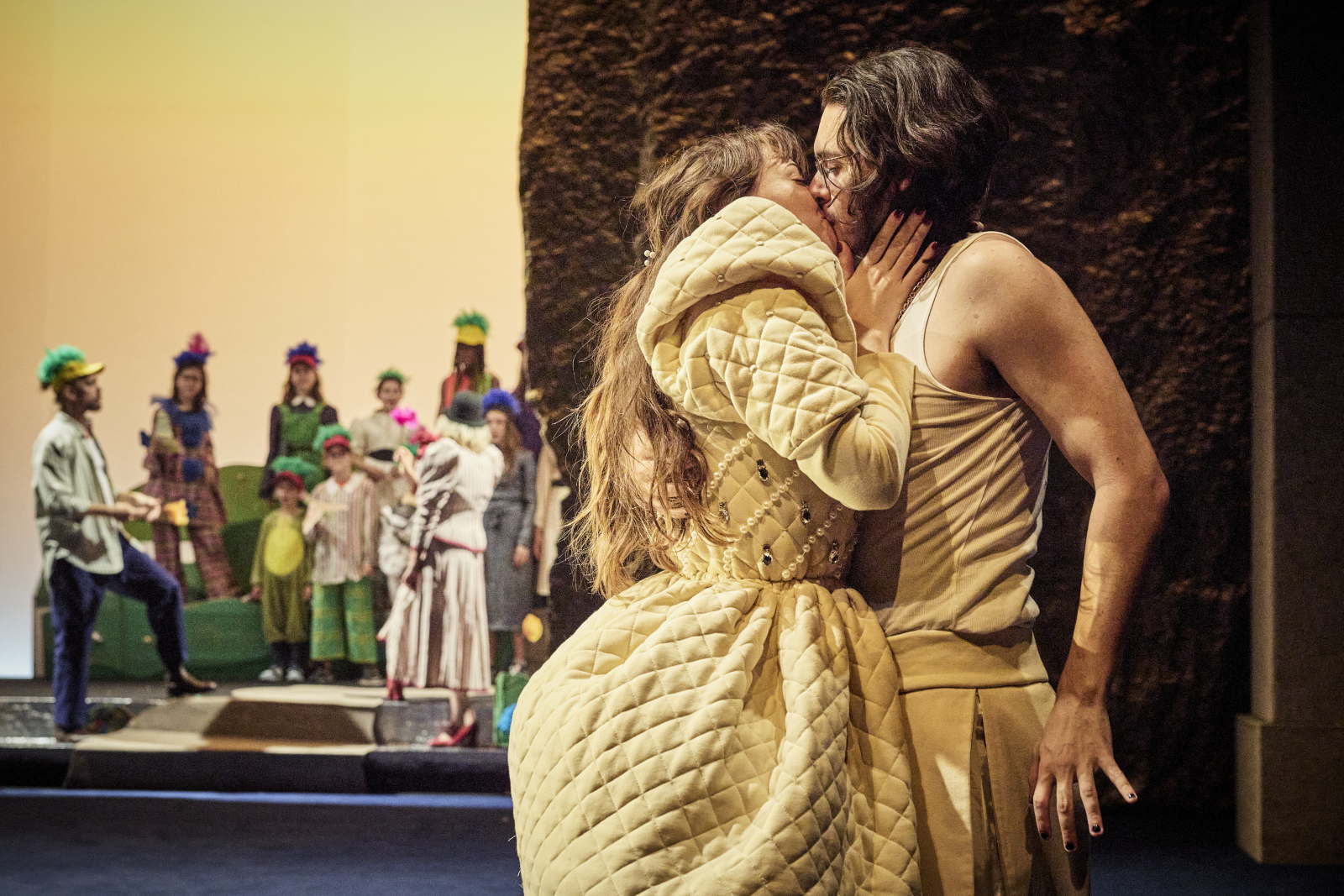 Les caractères sont brossés à touches délibérément grossies, si bien que leurs traits apparaissent saillants, voire caricaturaux. En fond de scène, l’agitation est tempérée par des images symboliques qui rappellent des épisodes de la vie de Roméo ou de Juliette sur un mode fantasmatique. Progressivement, le rideau s’ouvre, laissant se déployer un spectacle un peu enchanteur, comme un souvenir d’enfance qu’une ambiance techno vient inquiéter.