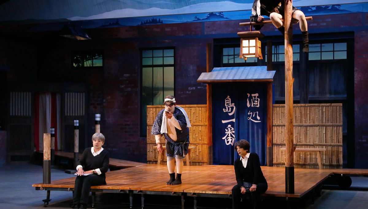 Les cerisiers en fleurs, les kimonos, les pontons aux poteaux surplombés de lanternes, les geishas et les bains chauds composent, souvent avec humour, une scénographie qui nous plonge dans une ambiance japonisante, fruit des souvenirs du voyage qu’Ariane Mnouchkine fit au Japon dans les années 1960.