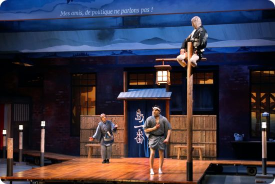 Cette histoire simple permet de faire une place sur le plateau aux différentes formes du théâtre traditionnel japonais. Les intermèdes sont l’occasion de changements de décors qui sont thématisés. L’inversion du sujet et du verbe permet de souligner le caractère artificiel du propos ; même la nudité est surlignée par des costumes exhibant de façon ridicule les sexes.