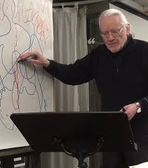 Louis-Michel de Vaulchier « inscrit » dans son exposition une voie (étroite ?) entre écrire et dessiner. Il joint le geste à la parole. D’une main (ou plutôt de la voix) l’artiste dit ce qu’il a écrit (de manière verticale), de l’autre il dessine le texte qu’il entend. La voix fait donc le lien entre les deux gestes. Il y a là un simultanéisme et un automatisme en rien surréalistes. Tout cela crée des embrouillaminis et une confrontation communicante pleine d’humour.