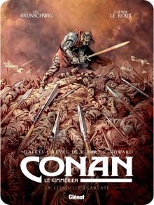 Luc Brunschwig (scénario adapté de l’œuvre de Robert H. Howard), Étienne Le Roux (dessin) & Hubert (couleur), Conan le Cimmérien – t.05 : La Citadelle écarlate, Glénat, coll. « Conan le Cimmérien », mars 2019, 72 p. – 14,95 €.