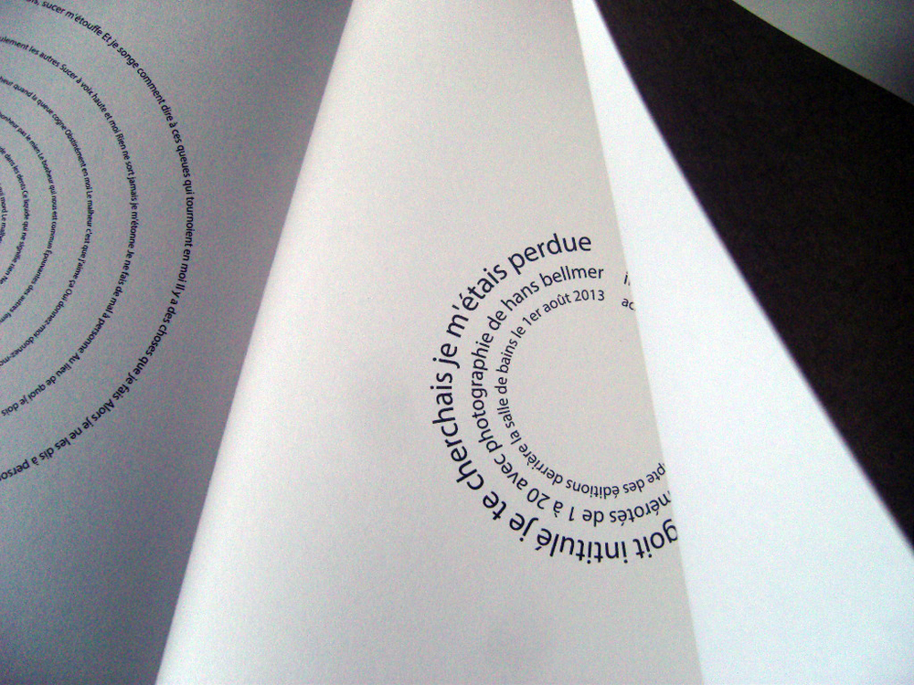 Marie Laure Dagoit une nouvelle fois brouille les lignes (et les cartes). Ou plutôt leur propose une floculation inédite et une autre distribution. A la ligne droite se substituent les cercles concentriques qui deviennent la succession d’ondes sur laquelle le message fait des vagues (à tous les sens du terme). Partant d’une photographie d’Hans Bellmer aussi provocante qu’évidente, la lettre d’amour prend un tour inattendu. « Heureusement » elle ne s’écrit pas : les mots semblent là pour surligner le cerclage signifiant de ce qui habituellement ne peut se dire.