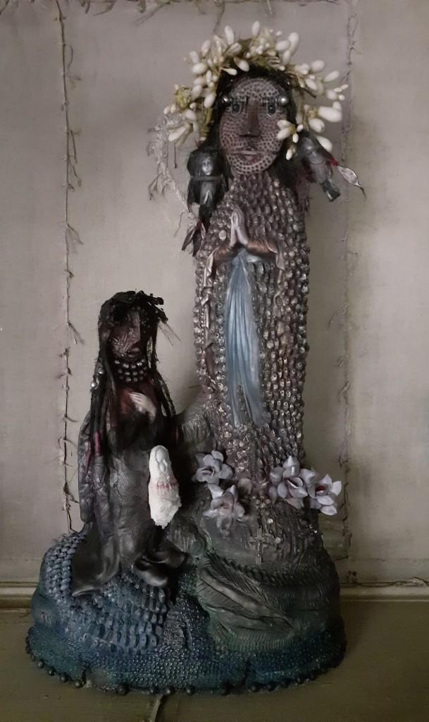 Mariette poursuit sa création poétique et plastique loin des sentiers battus. S’éloignant des dogmatismes religieux, elle les détourne pour ce qui arrive. A savoir, une remise en cause des images votives pour recréer du légendaire à sa main.