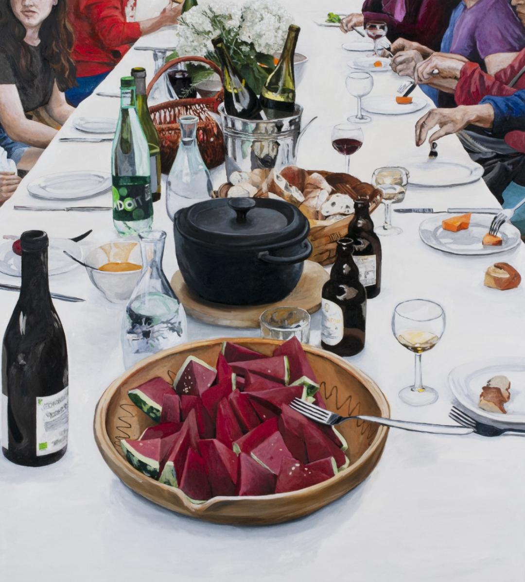 Les « repas blancs » sont des merveilles jouissives. La table est recouverte de blanc. Et les assiettes – forcément ou presque – de la même couleur. Autour, les conversations sont supposées animées mais des convives le regardeur ne distingue que les bras. Peut-on y voir une réminiscence des noces de Cana ? Certainement pas même s’il est question de partage, mais tout reste plus proche de nous.