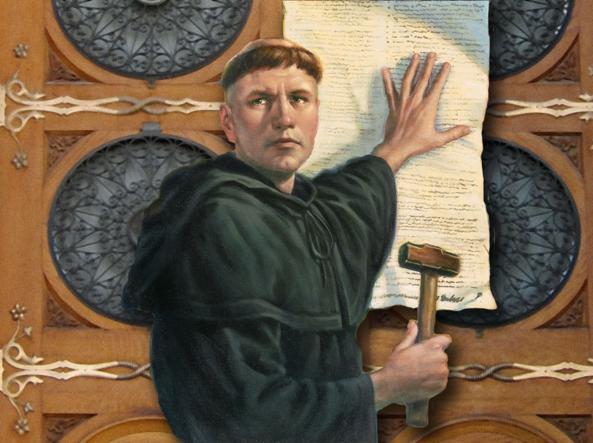 Un’immagine simbolica di Lutero che affigge le sue tesi sul portone della chiesa del castello di Wittenberg