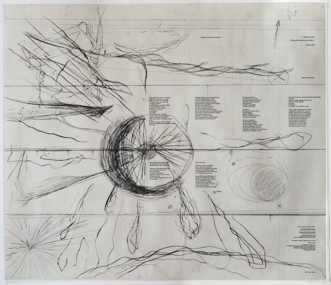 Les mots de Messagier s’adressent au visible et les dessins de Catherine Bolle à la visibilité qui résonnent dans l’espace et s’y établissent comme des « objets » concrets, tangibles.