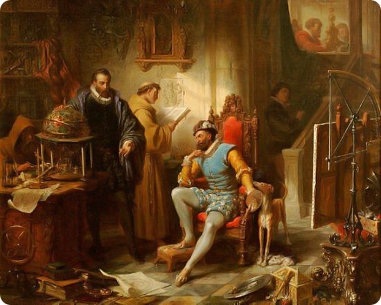 image ci-dessus : Tycho Brahé donne un cours d’astronomie à l’empereur Rodolphe II. Peinture de Edouard Ender (1855).