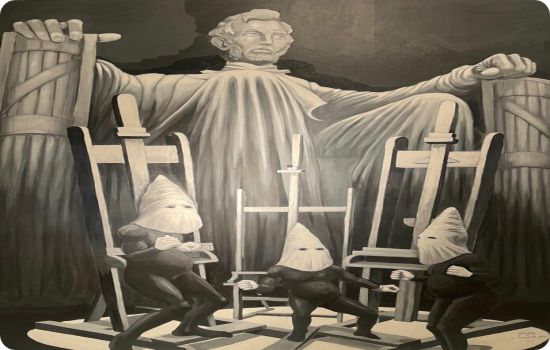 Pour lui, en dépit d’un certain retrait, il s’agit de raviver les conflits identitaires et raciaux de l’Histoire des USA et d’en dresser des constats. L’exposition de ses travaux inédits prouve à la fois la force imaginative du créateur et sa qualité d’exécution.
