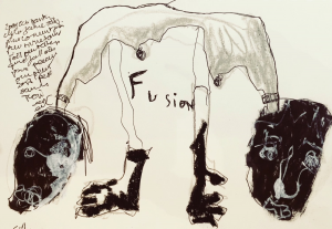 Dans leurs « grisbrouillages » qui mixent l’animalité à l’humain, les œuvres de Nathalie Collange possèdent une sauvagerie substantielle née sans doute des racines africaines de l’artiste autodidacte. Une éjaculation de matière et sève de sang noir brouille les lignes afin que tout s’unisse (mots compris) au sein d’un flux.