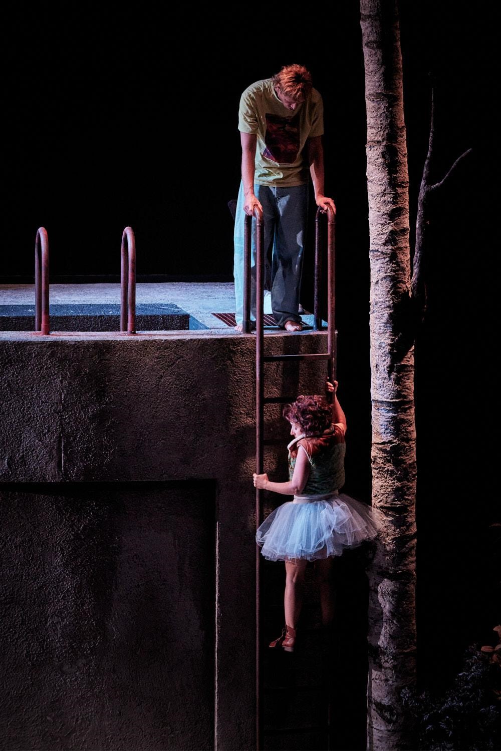 L’espace du plateau est partagé entre le champ silvestre ouvert, et le domaine fermé qui est celui de la restitution de brèves scènes qui expliquent ou complètent les événements vécus au présent parmi les arbres : ce sont des moments vécus à la ville, là où les êtres sont inscrits dans l’ordre de conventions, ne peuvent par suite pas être libérés. Initialement on perçoit un jeu de miroir, le reflet donnant l’impression d’être autonome, comme dans un tableau d’Edward Hopper dans lequel les personnages seraient animés d’un frémissement existentiel. Il s’agit d’un des effets de magie, discrets mais sensibles, du spectacle.