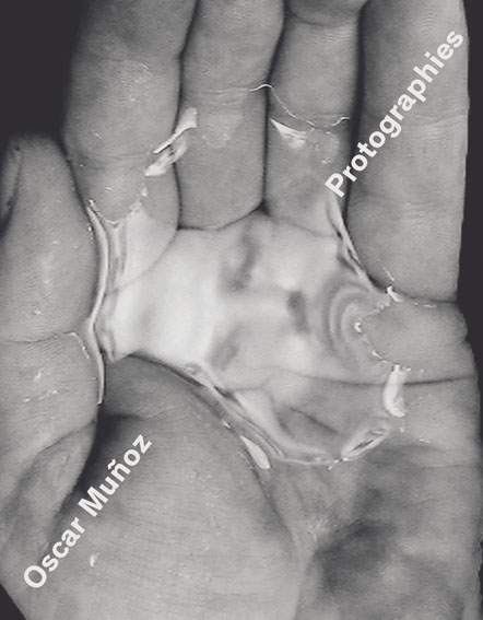 Surgit souvent des photographies du Colombien un aveuglement par éblouissement. La lumière dévore les contours et la netteté. « Rideaux de douche » laisse apparaître les fantômes roses de corps « effacés » derrière un rideau de plastique. Avec Tiznados (« Noircis »), d’un cadavre ne sont perceptibles que des contours vagues. Quant aux« Narcisses », leurs figurations au charbon de bois sont déposées au fond d’un bac d’eau. Avec l’évaporation du liquide ne demeure progressivement que la poudre charbonneuse que dilue l’image. Sont donc mis en acte les rapports de la vie et de la mort, de la présence et de l’effacement de l’image.