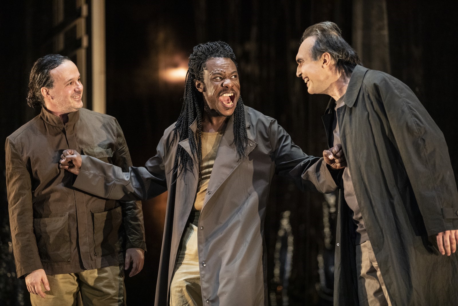 Deux comédiens profèrent des borborygmes, paraissant s’approprier une langue hermétique dans un décor ouvert, déstructuré, tamisé de lumières, laissant deviner en fond de plateau des profondeurs non manifestes. On en vient à ourdir un complot contre le général victorieux, au combat comme, bientôt, en amour.