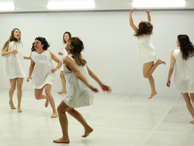 Après un retour à un état de régression (symbolisé par leur doudou), elles se maculent le visage de peintures et tracent des bandes sur leurs seins comme pour effacer leur genre et entament une ronde infernale. Leurs cris résonnent et elles jouent avec leurs entrejambes, avec le tintement de leurs boules qui vont rouler sur le plateau : les attributs de la masculinité voient leurs codes renversés.