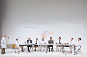 Une sonnerie. En guise de scène, un rectangle blanc s’avance vers le public, presque jusqu’à le toucher. Dans ce décor sobre, les espaces se fabriquent en direct, au fur et à mesure des besoins de l’intrigue, par la projection d’images vidéo en poursuite, à partir d’une activité interdite et délicieuse explorée dans l’enfance – on écrit sur le mur – et dans le minutieux ballet des accessoires. Sur ce plateau tout à la fois réduit et modulable où les comédiens évoluent très proches des spectateurs, on entre dans les coulisses de la médecine, avec une discussion crue ponctuée d’allusions. Les enjeux de pouvoir évoqués de façon elliptique dans les échanges n’en sont pas moins présents.