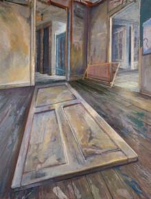 Sa première série exposée en 2013 montrait un sorte d’équilibre, à l’inverse La suite joue de la cassure. Entre autres, dans la peinture de portes vacillantes ou dégondées. Surgit comme l’écrit Alain Jaubert un passage « De l’enfer ou du paradis… De la vie ou du trépas… ». Les portes restent les seuils qui ouvrent sur l’incertitude. On ne sait ce qui se cache derrière d’autant que certaines d’entre elles sont projetées à terre.