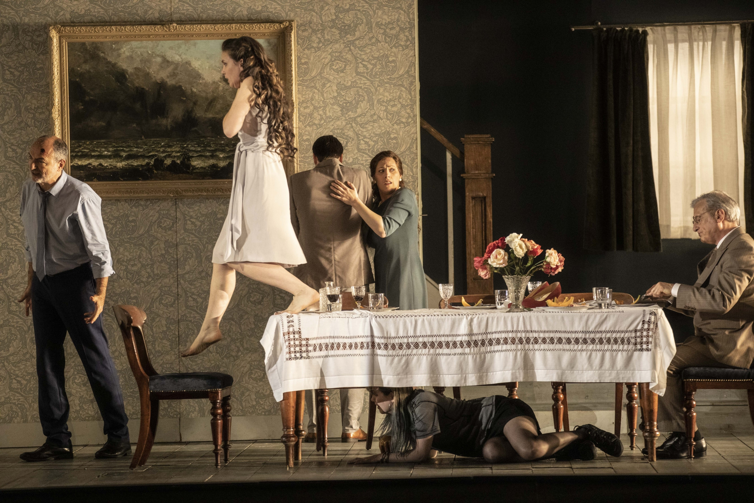 Et justement, cette scène initiale, dans la mise en scène de Mitchell, pose question. Maeterlinck, lui, la situe à la porte du château, lieu central du texte qui fonctionne un peu à la manière d’une scène d’exposition. Les servantes à l’intérieur (Mitchell les réduit à deux soubrettes sévères, muettes, contrôlant leur maîtresse) prononcent les premières paroles par deux fois : « Ouvrez la porte ! »