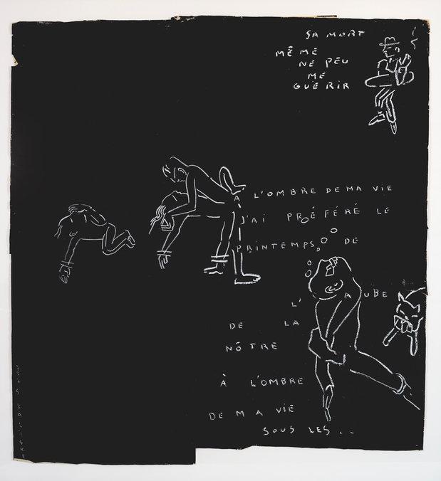 Dans l’oeuvre, ses dessins et leurs textes, le corps court dans ses feintes de délivrance, parfois à sa perdition.