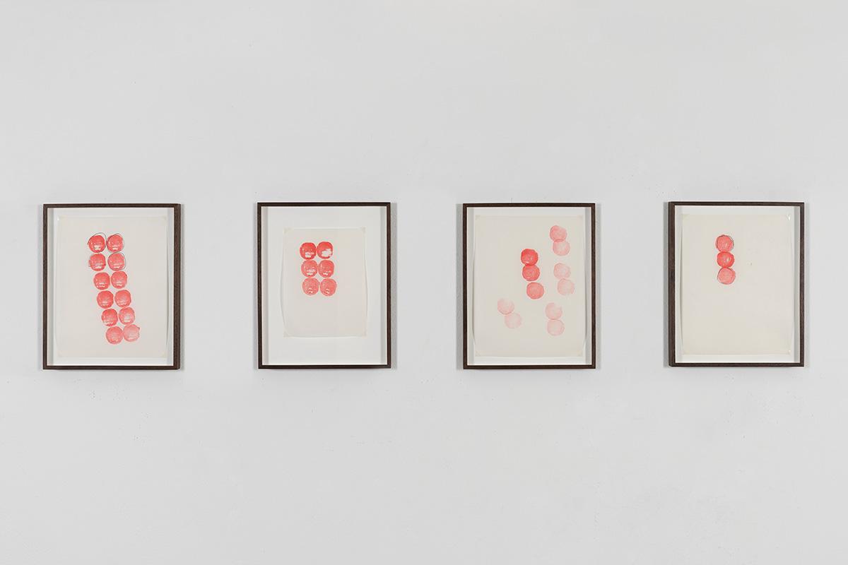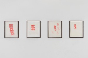 Des imprimés végétaux rouges marquent le parchemin créant un rythme. Les transparences de leur arrière-plan, l’intensité de leur immédiateté, parlent avec l’immédiateté de la lumière et du mouvement. Elles se souviennent de la saison du premier cinéma d’animation du XXe siècle avec ses géométries animées.