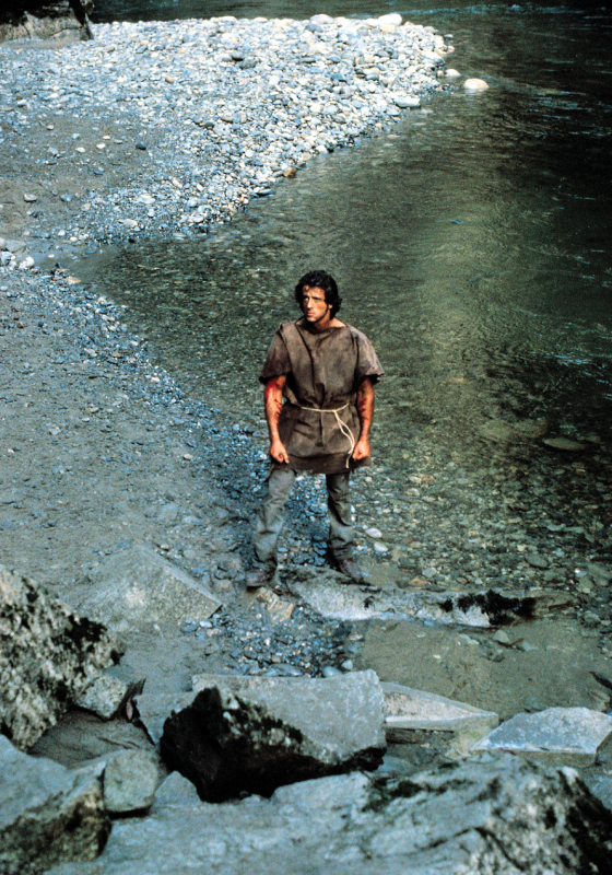 Et le voici, dans un contexte faisant songer aux Chasses du comte Zaroff (1932), sous un temps exécrable, loin de l’image du citoyen modèle du Contrat social cher à Rousseau (car les rapports humains apparaissent ici depuis le début insupportables, tirant plutôt du côté de « l’insociable sociabilité » évoquée par Kant dans L’idée d’une histoire universelle au point de vue cosmopolitique de 1784), arpentant la forêt muni de son seul couteau, taillant des piques, fomentant des pièges diaboliques, recousant ses plaies avec les moyens du bord, dévorant une cuisse de cochon sauvage tué au pal autour d’un feu de camp. Un milieu naturel à la James Fenimore Cooper qui exalte les soubassements premiers, primitifs de l’humanité et, plus généralement, de la mythologie de la littérature américaine. Rappelons qu’on voit, de manière symbolique, le soldat pourchassé accéder à la forêt chevauchant une moto et quasi nu.