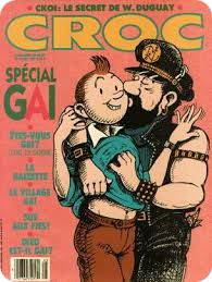 En définitive, la déviance, si elle n’est pas véritablement subversive, peut contribuer, les moeurs changeant, à la régulation, voire au renforcement de la norme. D’où l’attrait exercé par Tintin sur les parodistes, eux-mêmes apôtres de la déviance en tant qu’écart par rapport à la forme paradigmatique, qui ne se privent pas pour inventer à Tintin nombre de comportements sexuels satiriques, souvent plus ludiques que scandaleux. Autre façon pour Tintin d’honorer le sens littéral de la déviance en traçant de nouvelles lignes de fuite (on peut citer entre autres les pastiches Tintin en version X , Tintin fait un porno, Aventures libertines de Tintin n°1 de Jan Buquoy, et la revue Croc, »Special Gai » (Québec, 1983) où Tintin se fait frictionner par un Haddock SM ! Quiconque aspire à faire le bilan mouvementé de toutes ces exégèses tintiniennes peut aussi consulter notre ouvrage Après,Tintin… , éditons BOD, avril 2009)