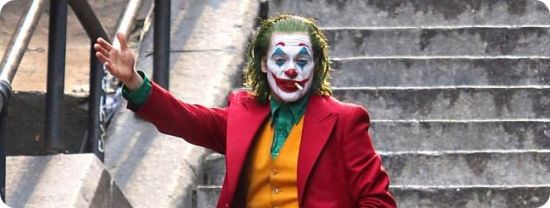 Celui qui va bientôt devenir le Joker porte déjà sa croix, entée sur ses chaussures disproportionnées, son costume 3 pièces voyant et son masque de clown triste.