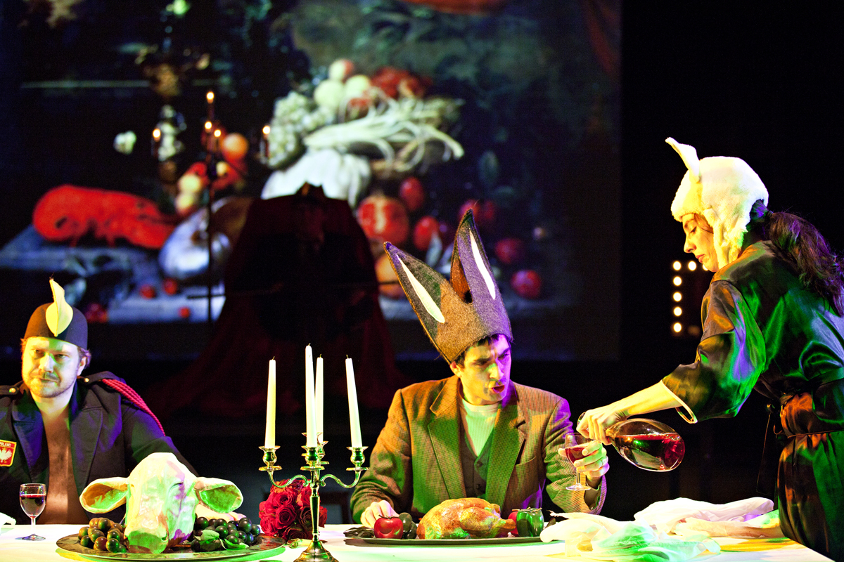 La scène a l’allure d’une remise de costumes, d’accessoires. Bien sûr on peut y répéter, mais elle semble dressée pour durer, comme figée par son bric-à-brac abandonné. En fond de scène, la vidéo semble montrer les acteurs qui se préparent. On craint une présentation didactique, lorsqu’un dit professeur vient présenter la pièce tout autant que défendre le principe de sa reprise. Mais on assiste bien vite à de nombreux changements de registre, propres à souligner, voire à accentuer les outrances du texte : on passe de la fête au silence, de l’entente à l’altercation, voire au pugilat dégénérant en meurtre. Quelques trucages élémentaires (fumigènes, bruits de canons, cris) suffisent à représenter l’atmosphère de la bataille. La compagnie parvient même à nous rendre presque sympathiques les personnages de ce drame ridicule.